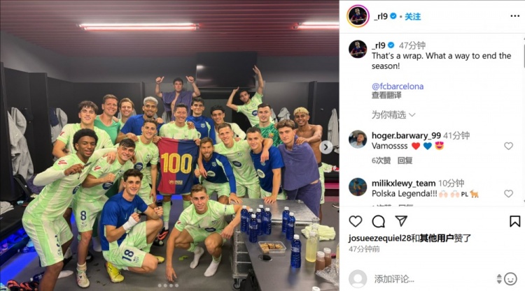 莱万晒出了球队在更衣室庆祝胜利的照片,配文写道;“本赛季圆满收官!多么好的结束方式!”