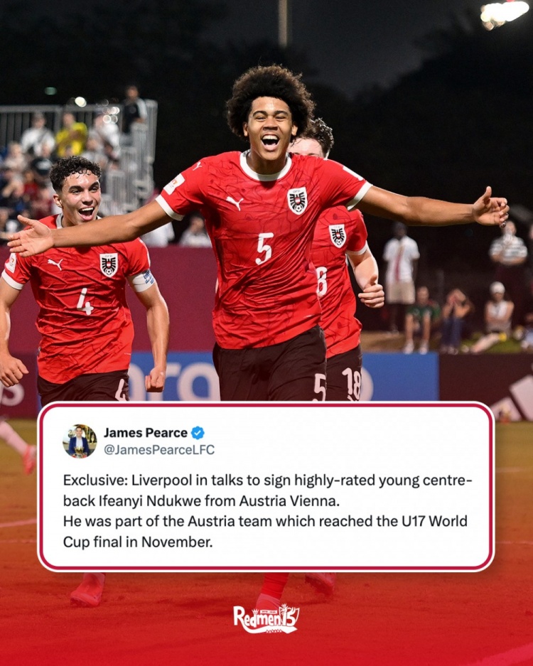 1月3日讯 据Theathletic报道,利物浦正在和奥地利维也纳洽谈,希望签下备受瞩目的年轻中后卫伊费阿尼·恩杜克韦(Ifeanyi Ndukwe)。这名奥地利青年队国脚要到3月才满18岁,但红军希望能在7月开启季前训练时完成转会。